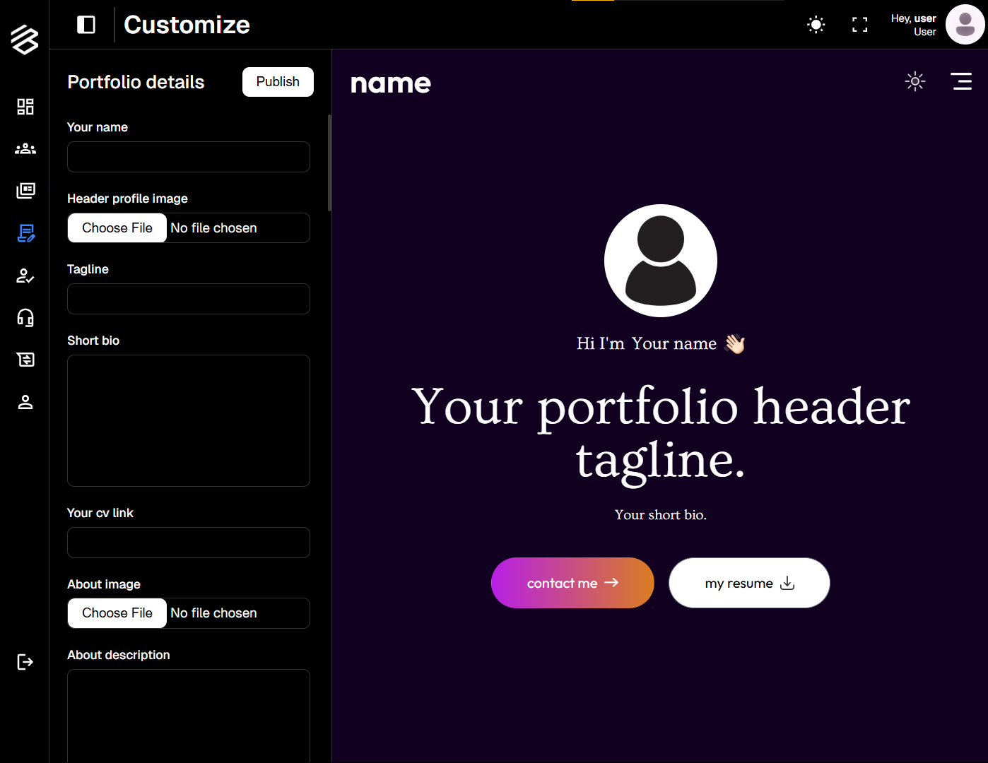 You can update content, images, banners, links, and skill tags using an intuitive side panel, while instantly previewing the changes in real time.